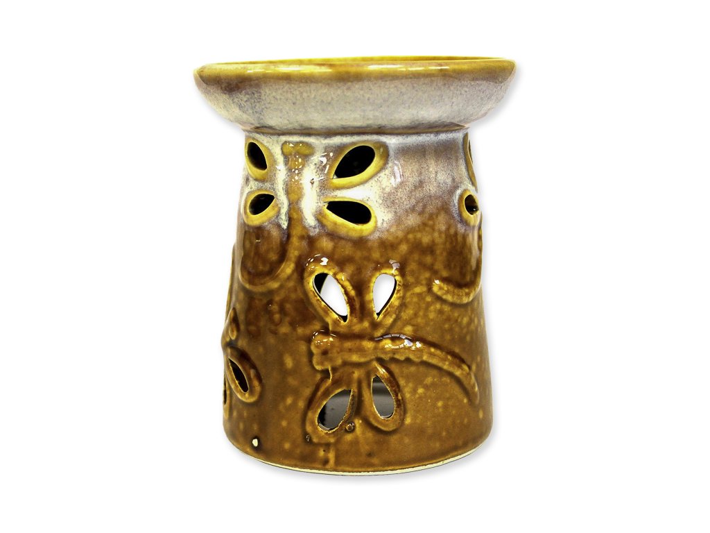 Keramická aromalampa v rustikálnom terakotovom štýle s pekným a jednoduchým vzorom vážky v hnedej farbe.