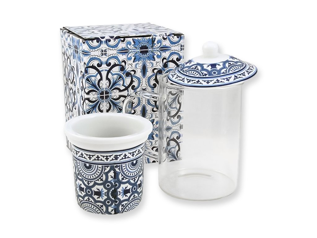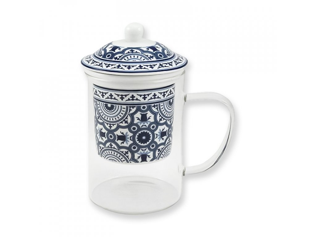 Sklenený bylinkový hrnček s vrchnákom, porcelánovým sitkom a modrým ornamentom.