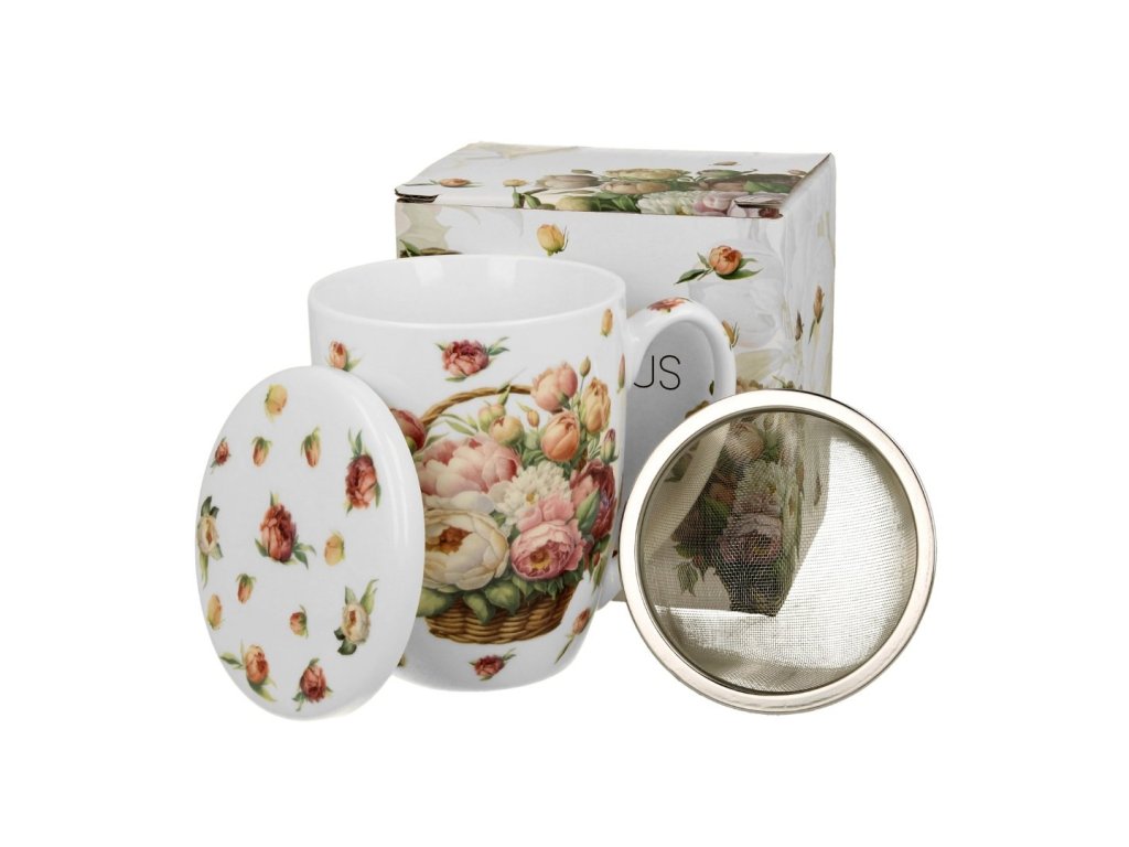 Bylinkový hrnček s vrchnákom a nerezovým sitkom s nádherným motívom prúteného košíka naplneného pôvabnou kyticou pivoniek v pastelových odtieňoch ružovej je ideálny na prípravu vášho obľúbeného čaju či aromatických byliniek.