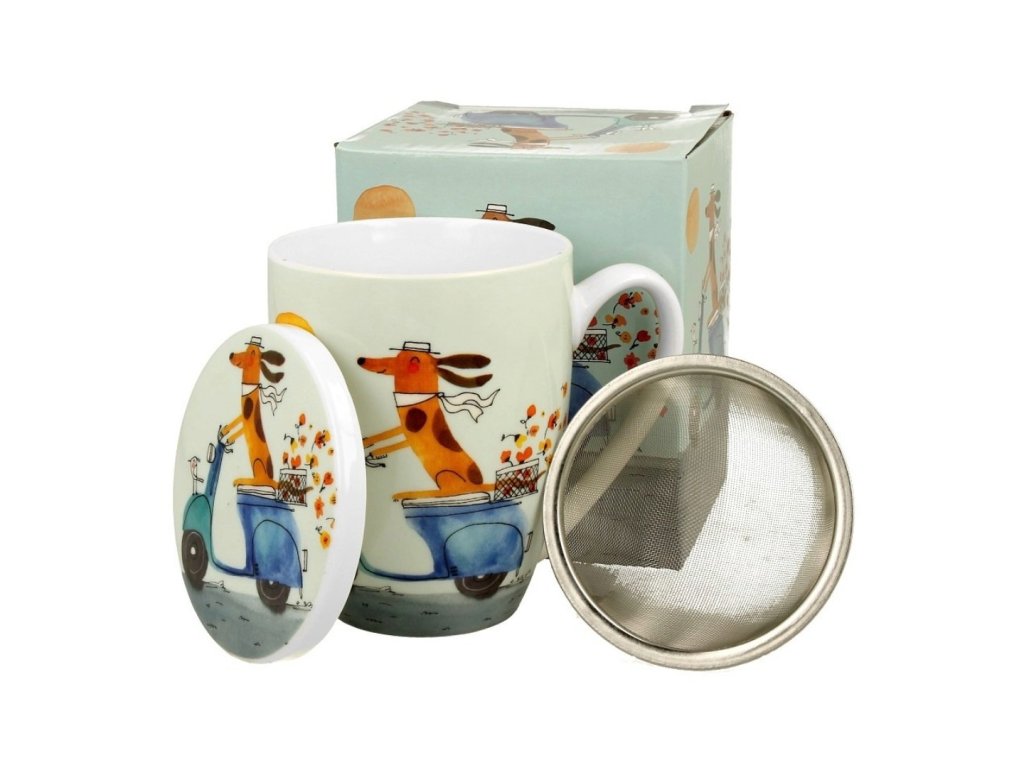 Bylinkový hrnček s vrchnákom a nerezovým sitkom s vtipným maľovaným motívom psíka na skútri je ideálny na prípravu vášho obľúbeného čaju či aromatických byliniek.