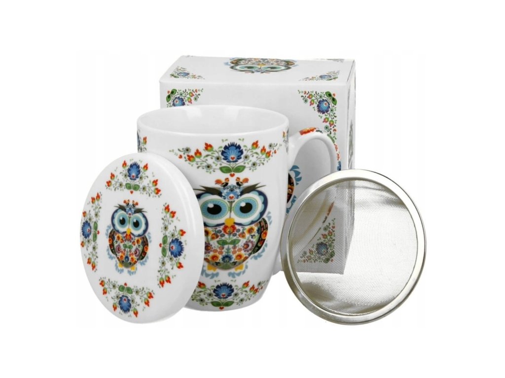 Bylinkový hrnček s vrchnákom a nerezovým sitkom s roztomilým motívom sovičky, poskladaný z etnických výrezov na bielom pozadí, je ideálny na prípravu vášho obľúbeného čaju či aromatických byliniek.