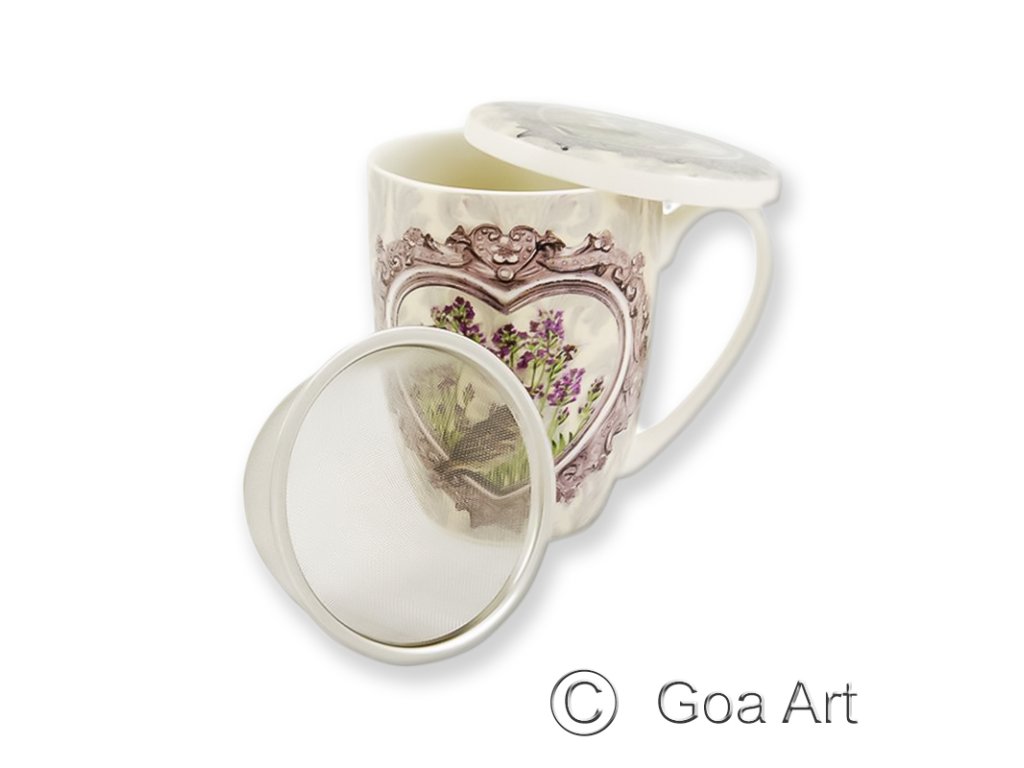 Porcelánový bylinkový hrnček s motívom levandule, porcelánovým vrchnákom a sitkom.