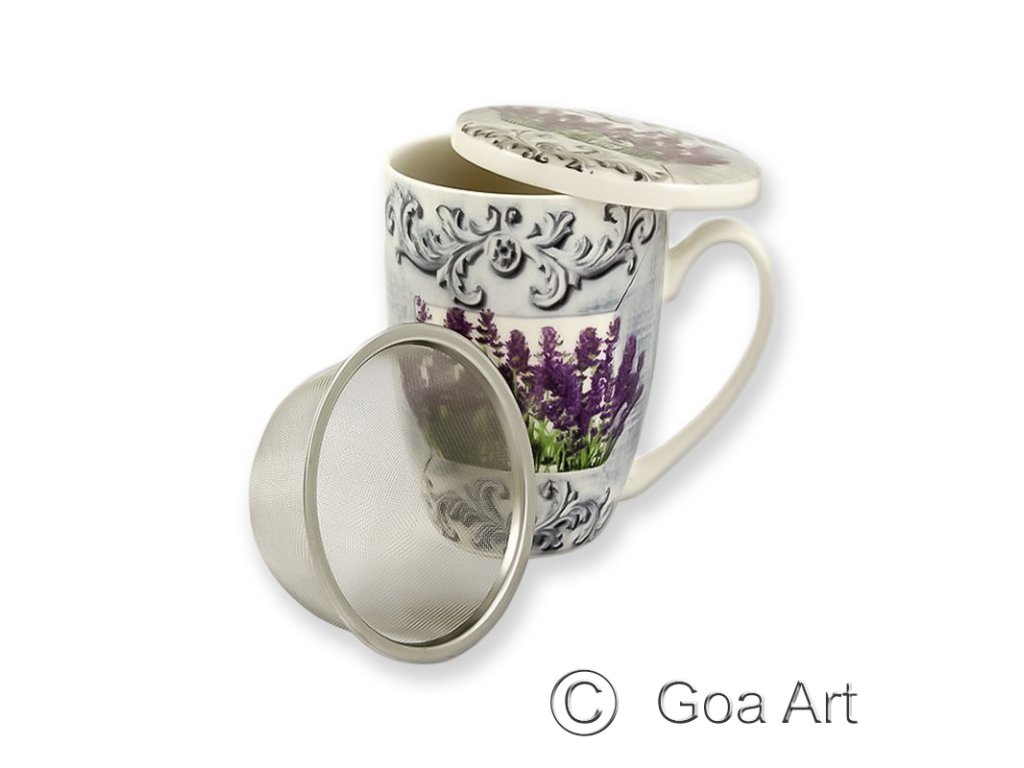 Porcelánový bylinkový hrnček s motívom levandule, porcelánovým vrchnákom a sitkom.