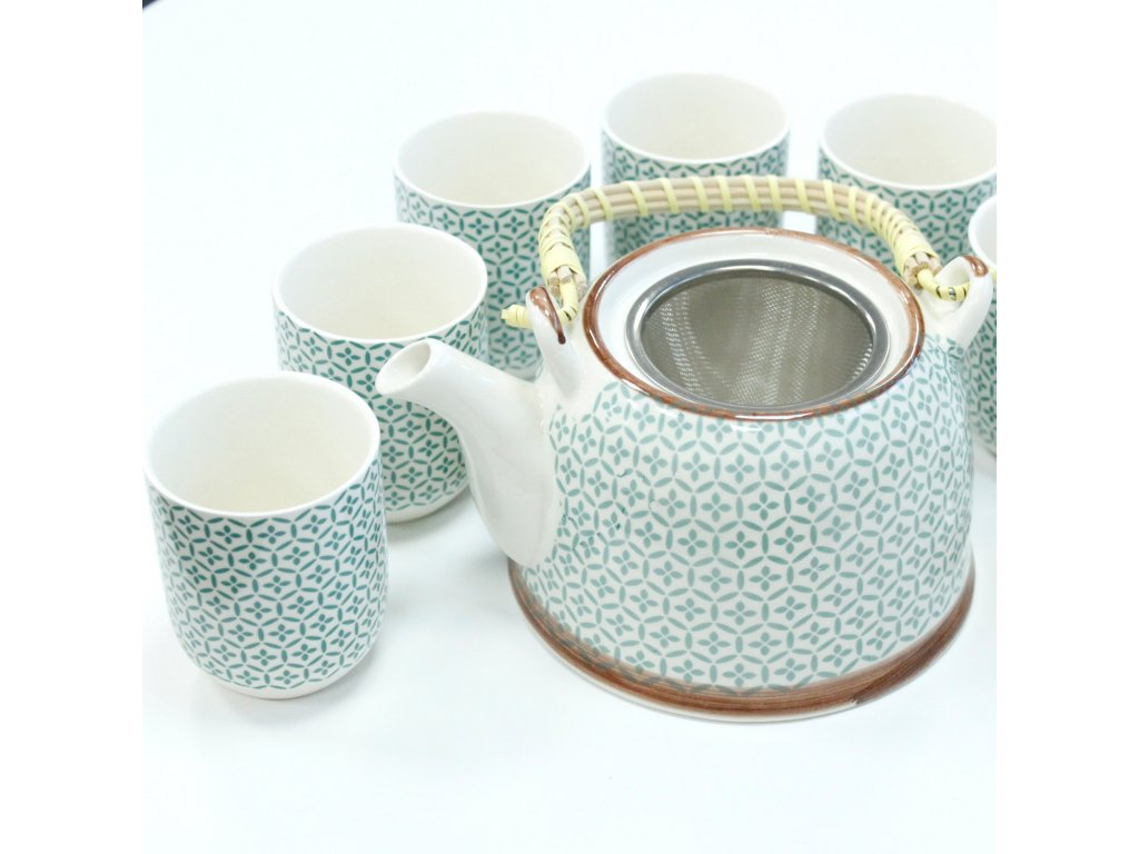 Čajová kanvica s kovovým sitkom a keramickou pokrievkou, doplnená šiestimi šálkami.