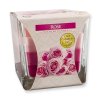 Dúhová sviečka v sklenenom hranatom pohári s trojfarebným voskom a jedinečnou vôňou ruže.