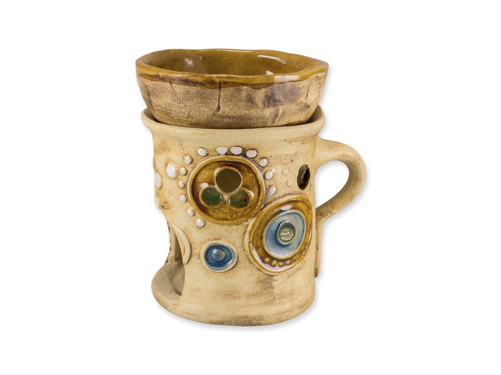 Dizajnovo originálna aromalampa, ručne modelovaná z kameniny s patinou a maľovaným reliéfovým vzorom od hrnčiara a keramikára z Liptova.