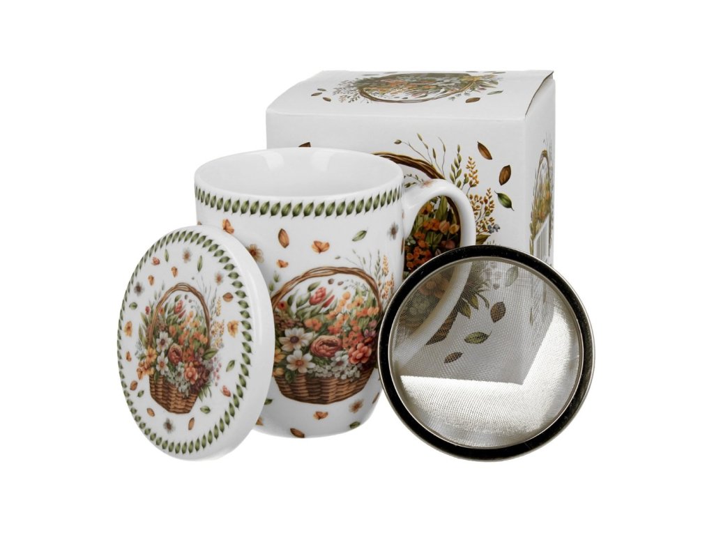 Bylinkový hrnček s vrchnákom a nerezovým sitkom s jemným motívom prúteného košíka naplneného pestrofarebnou kyticou poľných kvetov a padajúceho lístia v teplých jesenných farbách je ideálny na prípravu vášho obľúbeného čaju či aromatických byliniek.