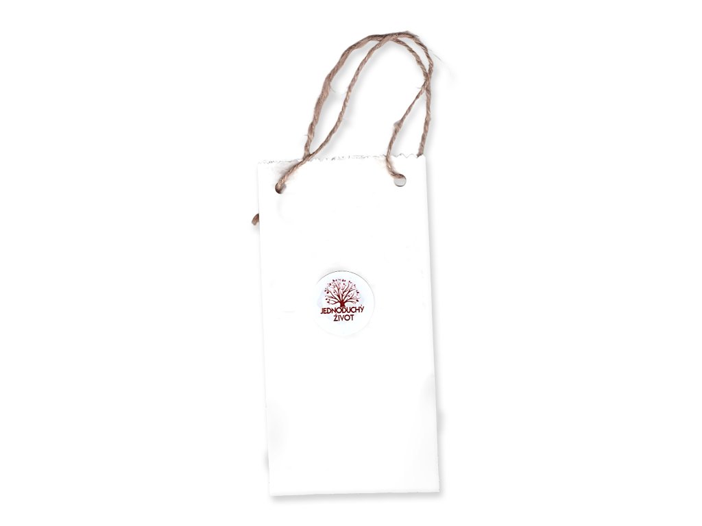 Darčeková taška vyrobená ručne z bieleho ekologického papierového sáčka a prírodného špagátu.