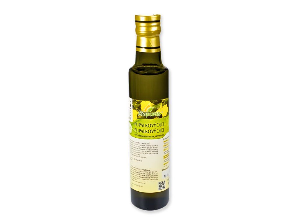 Zloženie: 100% olej z púpalky lisovaný za studena. Olej je bez umelých konzervačných látok a umelých farbív.