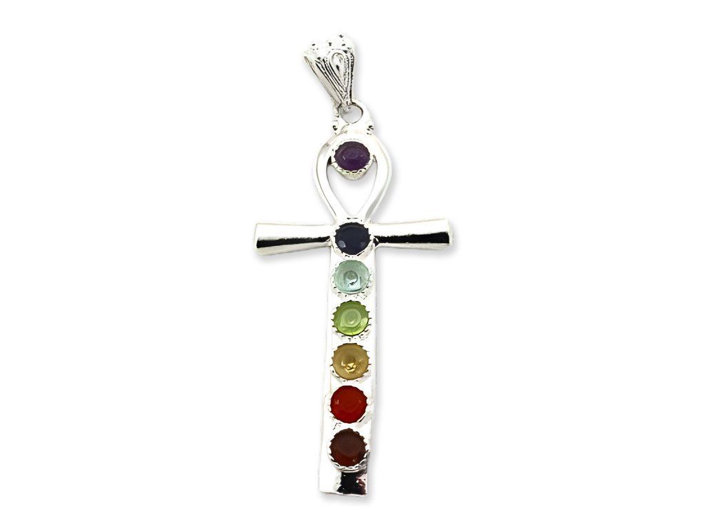 Postriebrený prívesok v tvare egyptského kríža s drahými kameňmi vo farbách čakier.