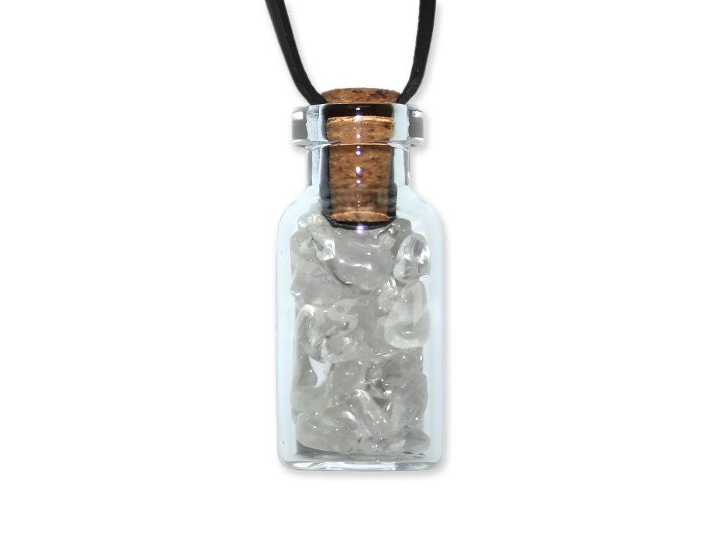 Prívesok v tvare sklenenej fľaštičky plnej malých krištáľových kamienkov. Prívesok je zavesený na čiernej koži.