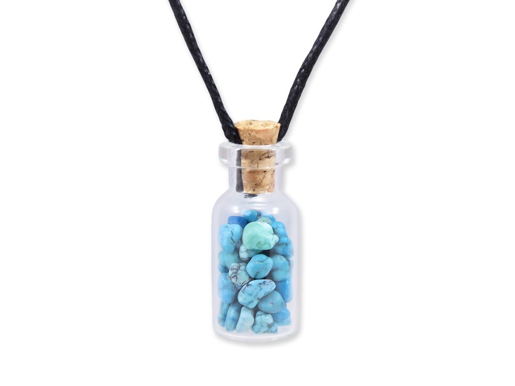 Prívesok v tvare sklenenej fľaštičky plnej malých tyrkenitových kamienkov. Prívesok je zavesený na čiernej koži.