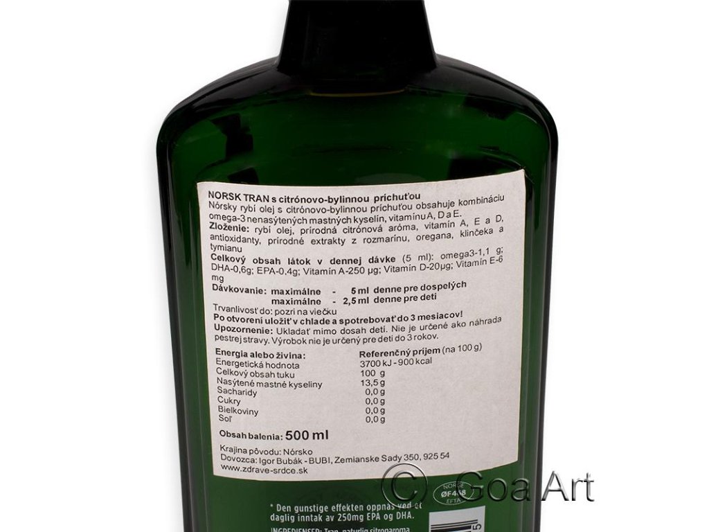 Norsk Tran je olej z treščej pečene v prírodnej kvalite bez obsahu umelých farbív a konzervačných látok, bez GMO a geneticky modifikovaných derivátov.