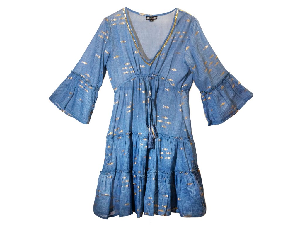 Nomád Sari - Šaty Ručne Maľované - Zlaté rybky - Modré M/L