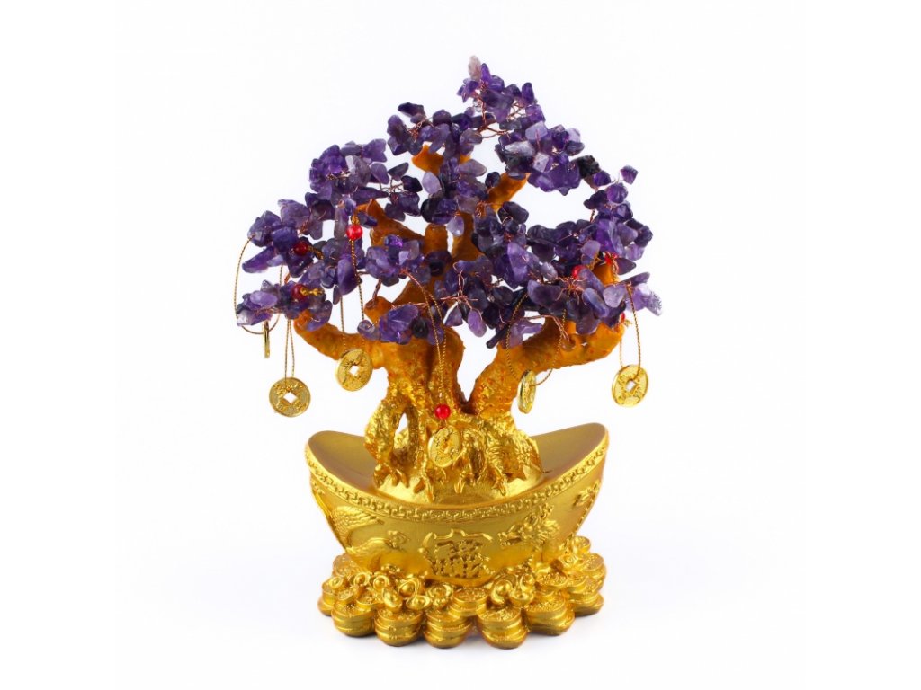 Strom života s mincami a ingotom bohatstva Ametyst 26 cm
